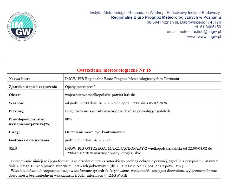 IMGW wydało ostrzeżenie drugiego stopnia przed opadami marznącymi, które mogą powodować niebezpieczną gołoledź. Od wtorku 4 lutego od godz. 22:00 do środy 5 lutego do godz. 12:00. Prognozowane są opady marznącego deszczu.